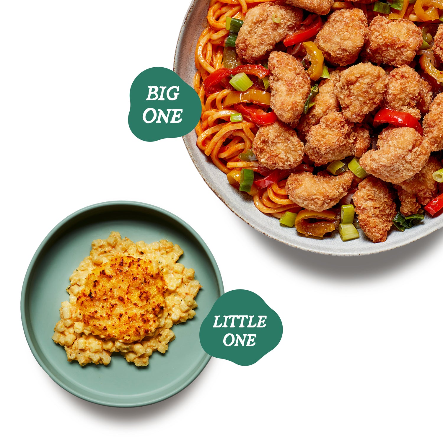 Two family favourites in one. For parents, we've gone for a meal you might usually class as an indulgent treat, kept the traditional taste, and reinvigorated the dish with a phenomenal sweet chilli sauce made with healthy pea protein.